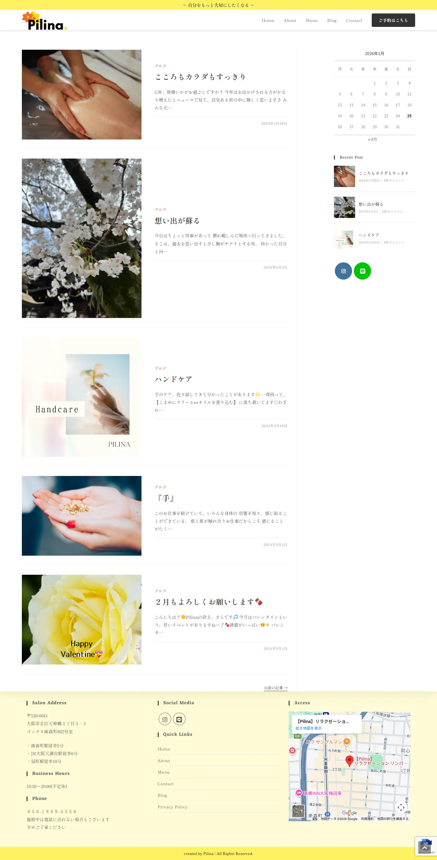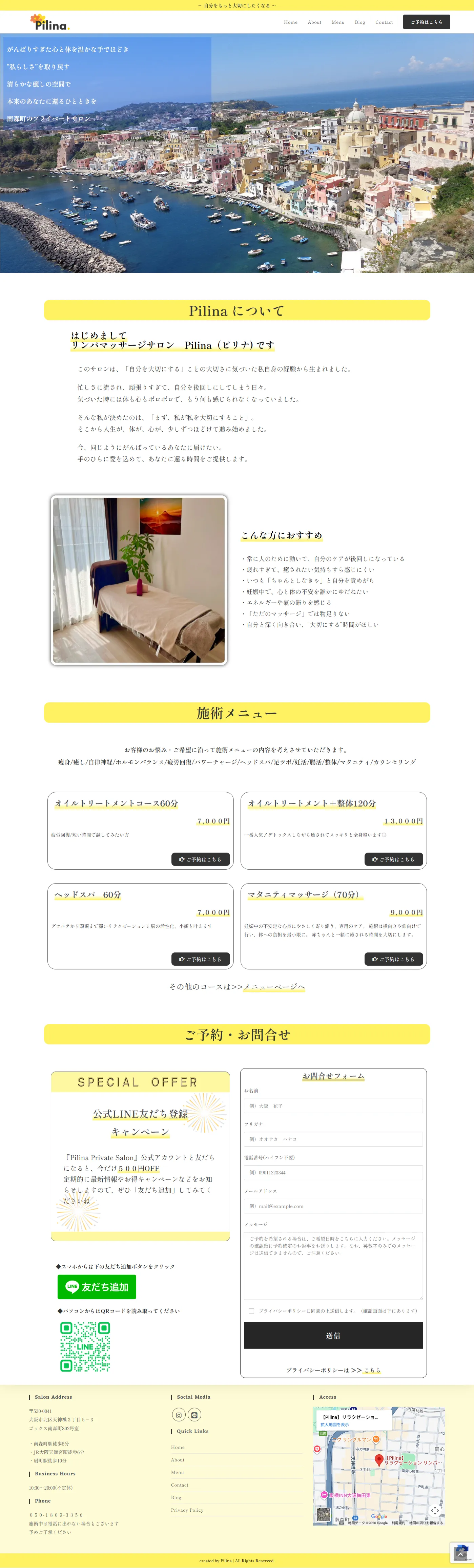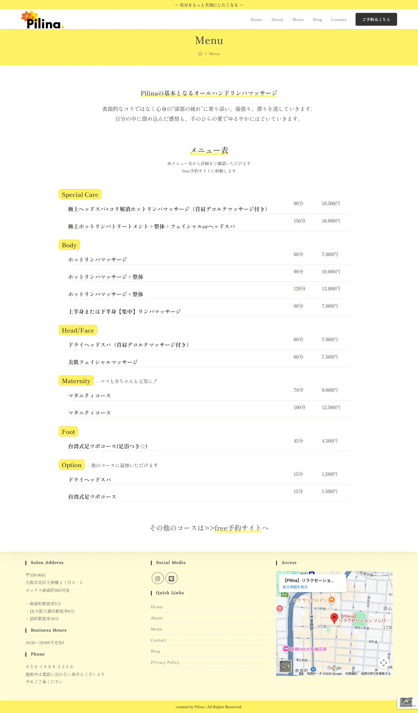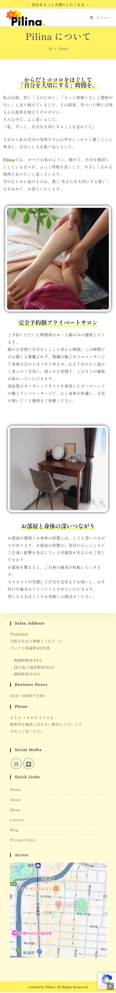 - オーナー様のマッサージサロンに対する想いが熱く、文章が比較的に多いので、爽やかなレモンイエローをメインカラーとして使用し、重くならないよう工夫しました。書体は「しっぽり明朝」を使い、少しこだわりのある雰囲気を作りました。