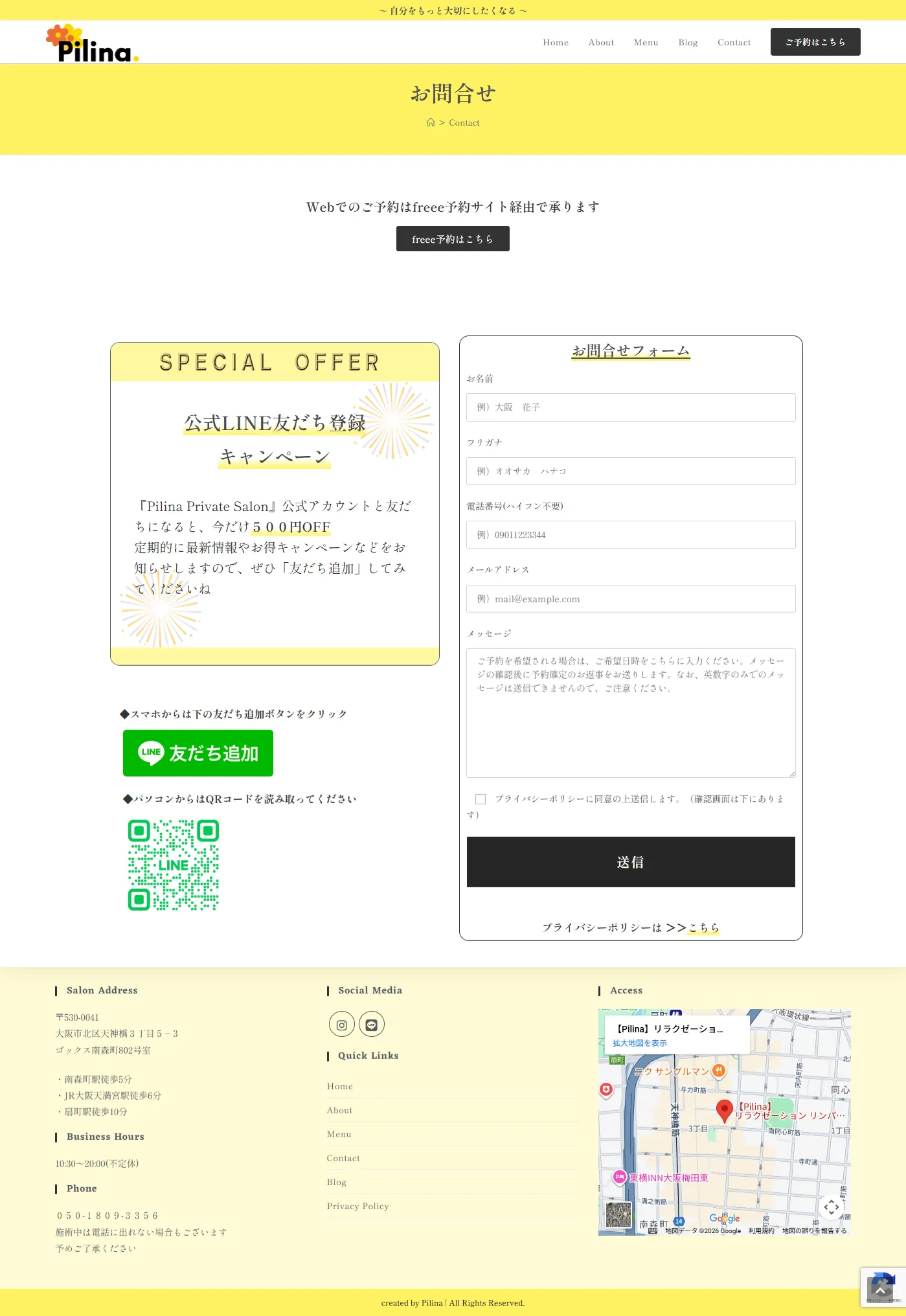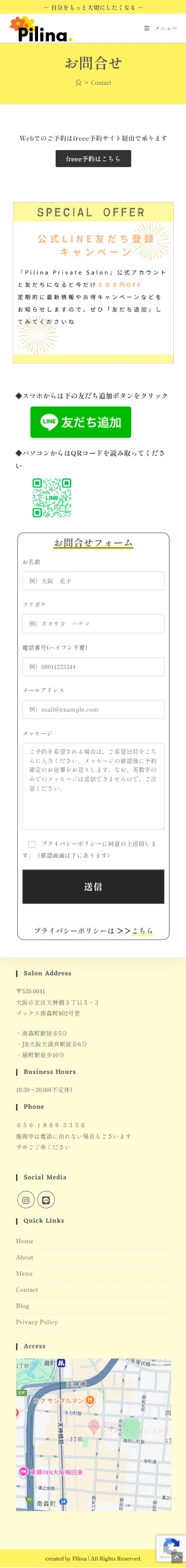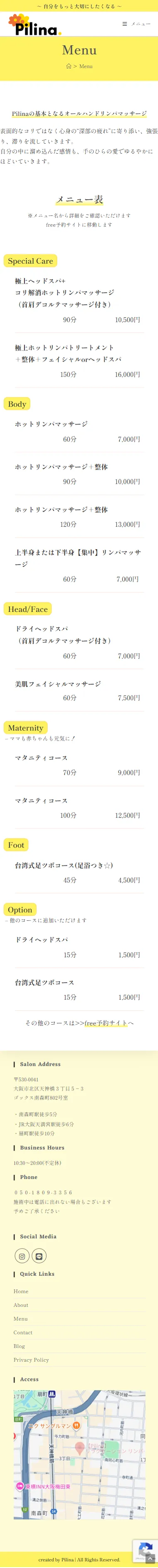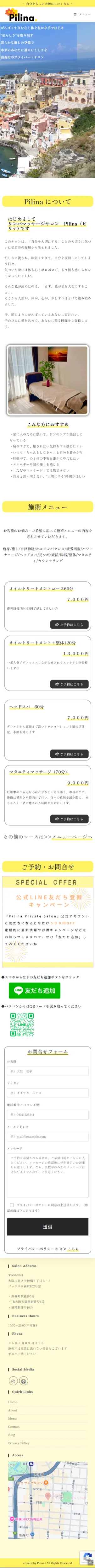 - オーナー様のマッサージサロンに対する想いが熱く、文章が比較的に多いので、爽やかなレモンイエローをメインカラーとして使用し、重くならないよう工夫しました。書体は「しっぽり明朝」を使い、少しこだわりのある雰囲気を作りました。